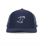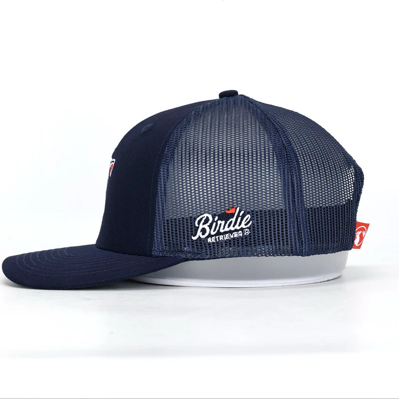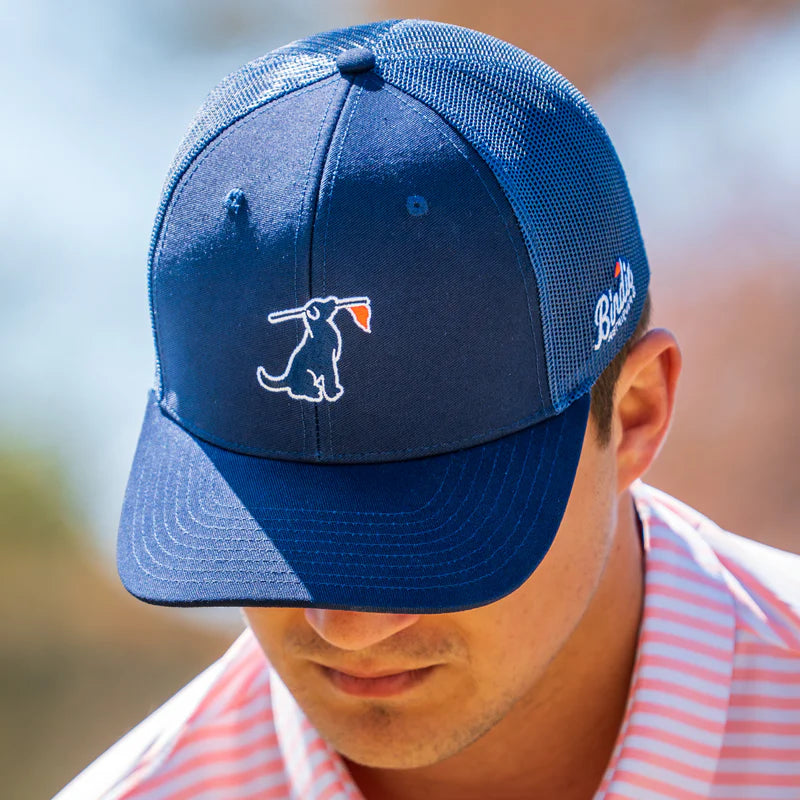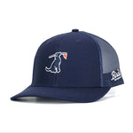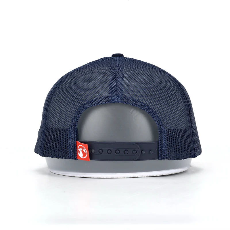 The all-new Course Commander Navy Trucker Hat sets a new standard in comfort, style, and craftsmanship with its modern trucker silhouette, pro round crown, and perfectly structured chino twill front panels. Designed for a superior fit, it features breathable mesh back panels, a comfort-wrapped sweatband, and bold contrast stitching for a sharp, standout look. A slight pre-curve brim, woven loop label, and adjustable plastic snap closure complete this elevated essential built for all-day wear.