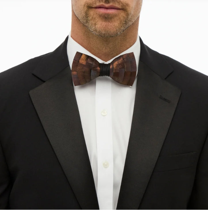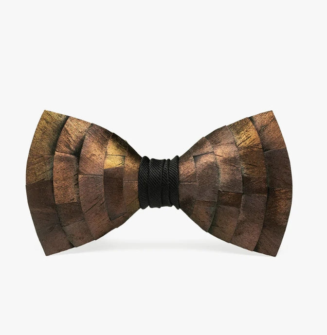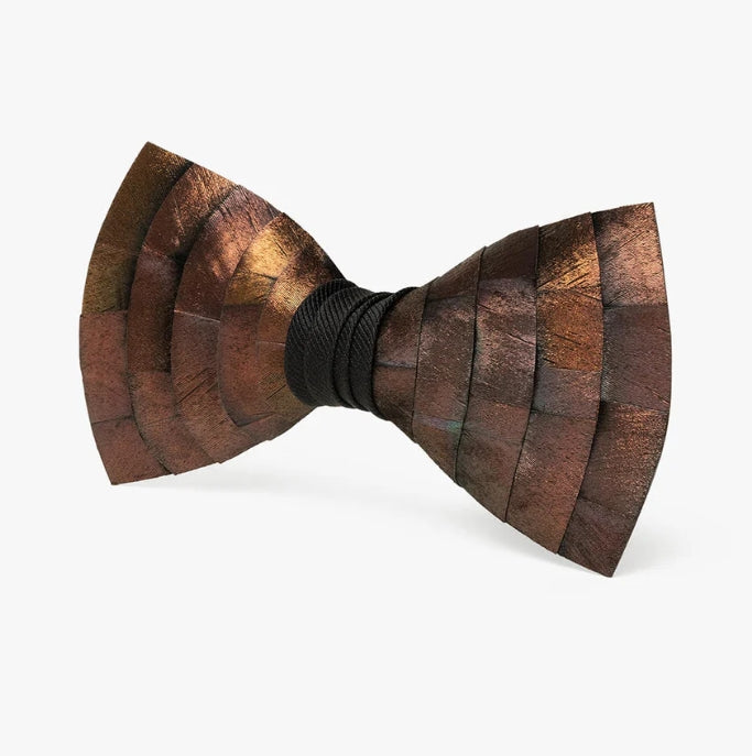 Inspired by the layered beauty of treetops and the shifting colors of sunlight through leaves, the Canopy Bow Tie showcases the stunning natural iridescence of all turkey feathers in a masterfully crafted design. An arching feather layout highlights the full spectrum of tones within the copper turkey plumage - revealing flashes of bronze, green, gold, and deep rust as the light shifts. Each feather is sustainably sourced and hand-placed to create depth, movement, and organic symmetry that mirrors the forest canopy itself.