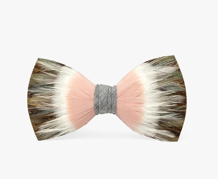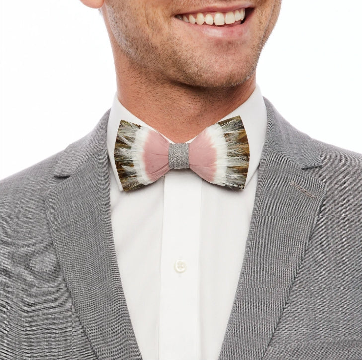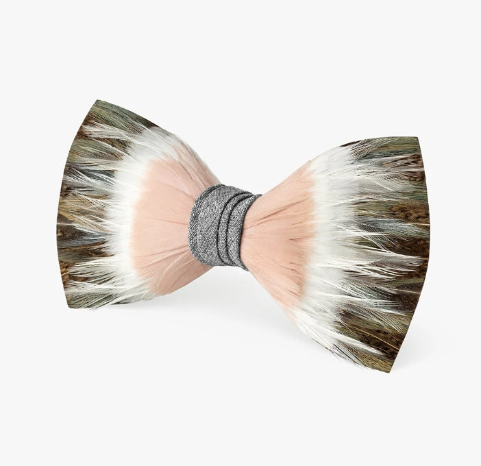 The Royal bow tie is crafted with blush goose feathers that are layered over transparent, off-white rooster feathers and a mix of green and brown pheasant feathers. Center wrap is a light grey linen material.