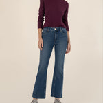 Elevate your look with our high rise Fab Ab ankle flare jeans in a classic medium wash. Made with super stretchy material and featuring smoothing Fab Ab pockets, these jeans provide comfort and a flattering fit. The stylish ankle flare and unique Nest Leg design add a modern touch to any outfit.