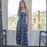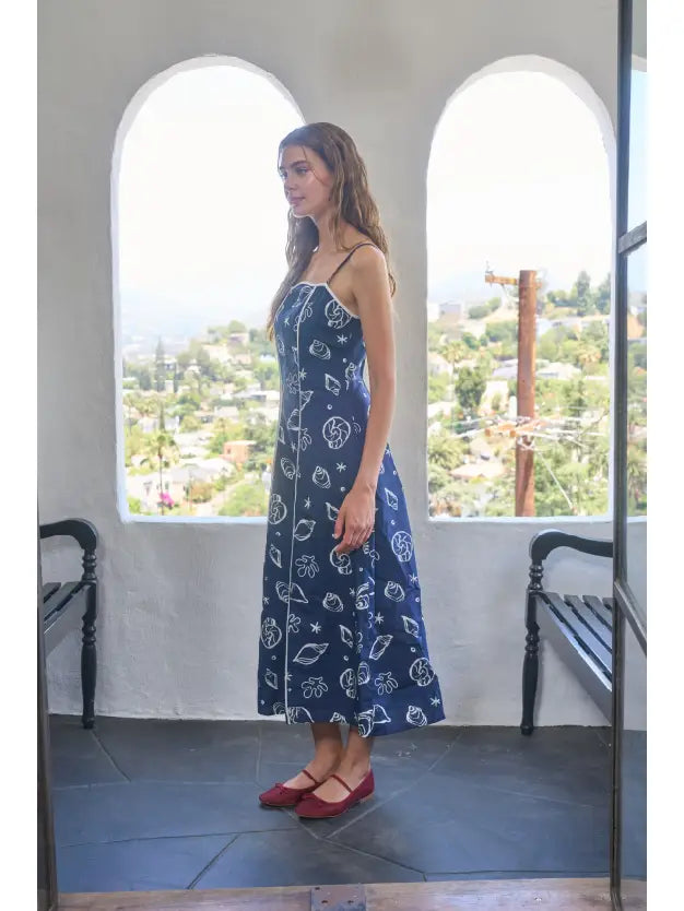 Scallop neckline Adjustable spaghetti strap Contrast line detail Sea motif pattern Lined Midi dress