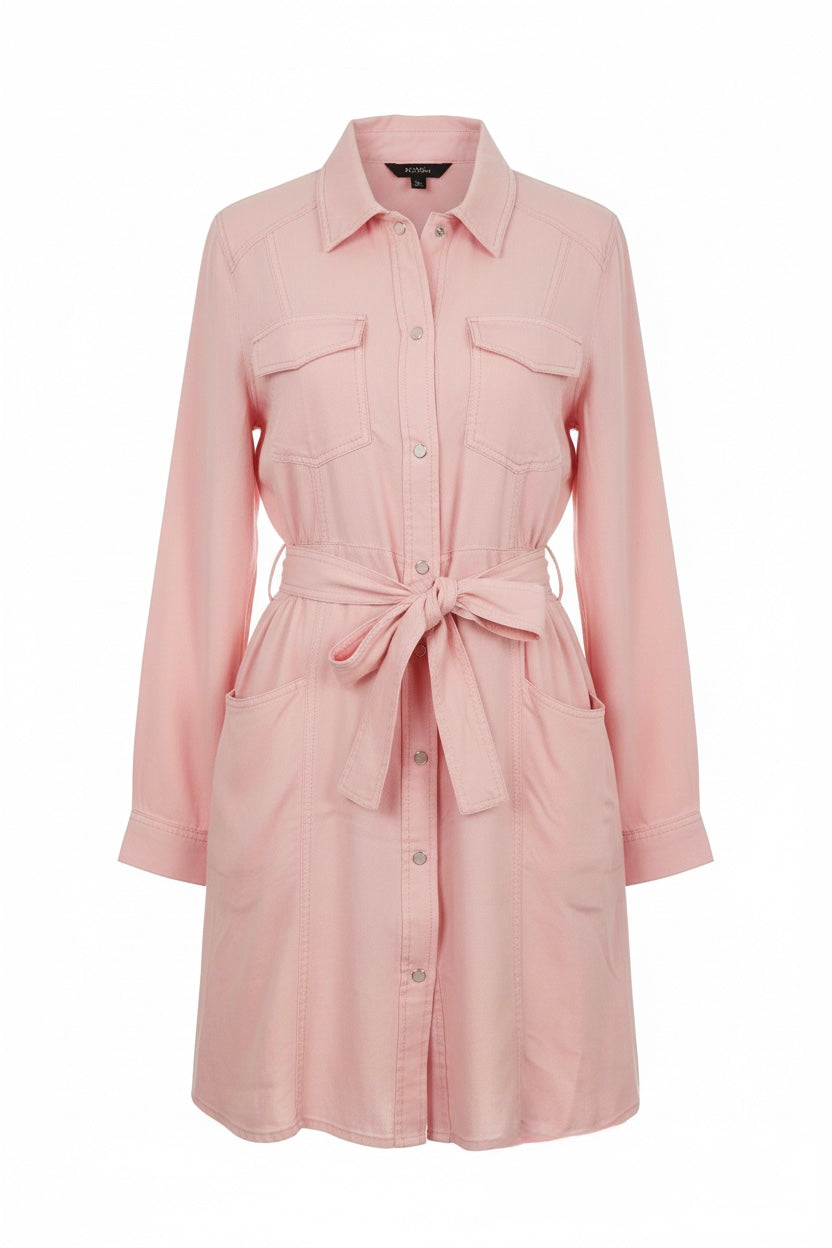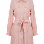The Deena Dress is an effortless blend of structure and femininity. Designed in a soft blush pink, this button-front shirt dress features a classic collared neckline, long sleeves, and functional chest and side pockets for everyday ease. A self-tie waist cinches the silhouette for a flattering, customizable fit, while the lightweight fabric drapes beautifully for all-day comfort. Perfect for dressing up with heels or keeping it casual with flats, the Deena Dress is a versatile staple you’ll reach for season after season.